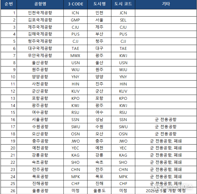 국제공항 8곳은 인천, 김포, 김해, 제주, 무안, 양양, 청주, 대구 공항이다.