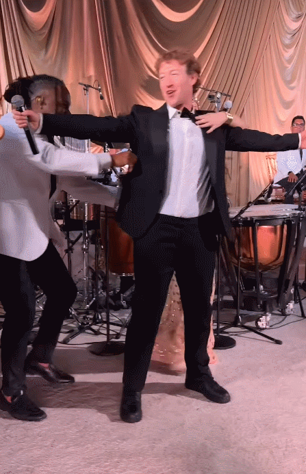 파티 참석자들은 저커버그의 깜짝 공연에 환호했다. 아내인 챈은 포복절도했다.