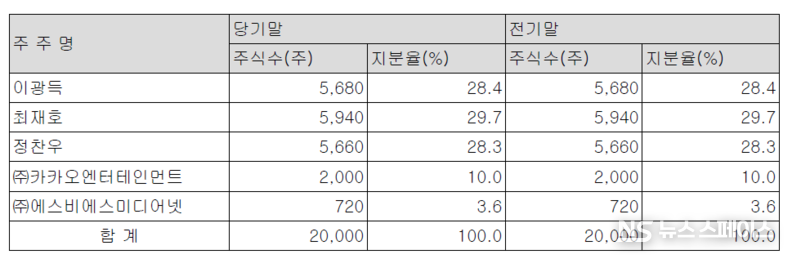결국 최재호 이사는 29.7% 지분을 보유한 최대주주가 됐으며, 이광득 대표(28.4%), 개그맨 정찬우(28.3%), 카카오엔터(10%), SBS미디어넷(3.6%)의 지분구조는 전년과 동일하다.
