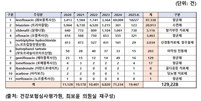 금기 의약품은 총 22종이며, 이 중 11종은 실제 의료기관에서 처방돼 청구된 것으로 나타났다. 가장 많이 처방된 약품은 항균제 ‘레보플록사신’(9만7338건)으로, 2023년 12월 보건복지부의 급여 예외 인정 고시 이후 급증했으나, 식약처 지정 연령금기 상태는 유지되고 있다.