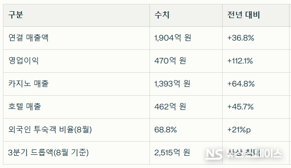 마카오의 규제 강화로 중국 VIP 고객들이 한국으로 이동하는 흐름도 뚜렷하다. 제주 드림타워는 이 수요를 흡수하며, 5월 월매출 400억원 → 8월 2,500억원 드롭액 경신 등 업계 최고 성장률을 기록했다.