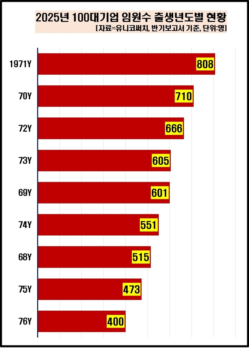 글로벌 헤드헌팅 전문기업 유니코써치(대표이사 김혜양)가 ‘2025년 국내 100大 기업 임원 연령대 현황 분석’ 조사 결과에서 도출됐다고 27일 밝혔다. 조사 대상은 상장사 매출액(2024년 별도 기준) 상위 100곳이고, 각 기업의 올해 반기보고서를 토대로 사내이사와 미등기임원을 대상으로 조사가 이뤄졌다. 사외이사는 조사에서 제외했다.