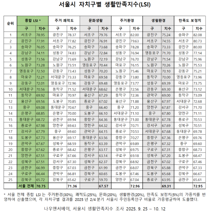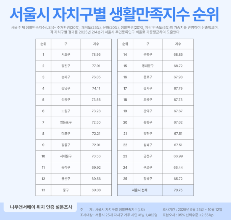 인터넷 통신사 엘림넷의 설문 플랫폼 나우앤서베이의 2025년 조사 결과, 서초구가 78.95점으로 서울 25개 자치구 중 가장 높은 생활만족지수 1위를 기록했다. 전체 평균 70.75점 대비 8.2포인트 높은 수치로, 주거환경(82.00점), 문화생활(79.76점)에서 특히 우수한 점수를 받았으며, 공원과 산책로, 문화시설이 풍부한 점이 큰 장점으로 꼽혔다.
