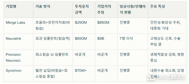 머지 랩스와 경쟁사 뉴럴링크는 최근 뇌-컴퓨터 인터페이스 분야에서 전례 없는 투자 규모와 기술 진전을 보이고 있다. 뉴럴링크는 올해 6억5000만 달러(약 8770억원) 투자 유치, 90억 달러(약 12조1000억원) 수준의 기업가치 평가를 받았으며, 현재 7명만이 실제 인간 이식 수술을 받은 것으로 공식 집계된다.