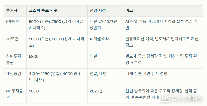 이처럼 국내외 증권사는 공통적으로 내년 코스피가 강한 실적 성장과 저금리·저물가·저환율의 3저 환경에 힘입어 5000선 돌파를 넘어 장기적으로는 7000대 중반까지 오를 여지가 있다고 전망한다. 단기 조정은 강세장의 자연스러운 과정으로 해석되며, AI 산업과 실적 성장이라는 펀더멘털을 바탕으로 한 강세장 지속 기대감이 확산되고 있다.