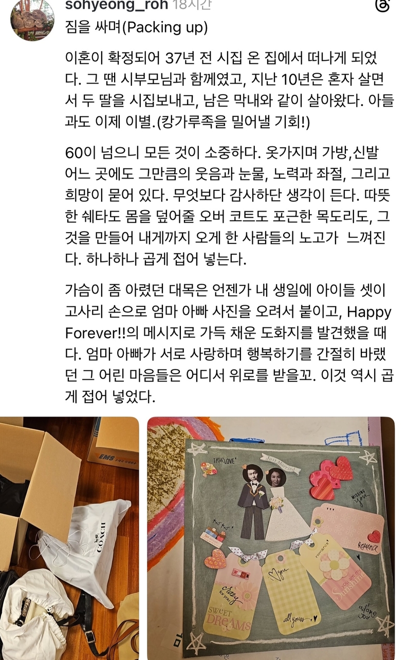 특히, 가슴이 아렸던 대목은 언젠가 생일에 자녀들이 ‘Happy Forever!’라는 메시지로 가득 채운 도화지를 선물했던 기억을 고백한 부분이다. 해당 도화지는 엄마 아빠 사진 위에 종이로 만든 턱시도와 드레스, 여러 장의 메시지 카드가 장식되어 있었다. 그는 "엄마 아빠가 서로 사랑하며 행복하기를 간절히 바랐던 그 어린 마음들은 어디서 위로를 받을꼬"라며, 자녀들의 순수했던 염원을 곱게 접어 짐속에 넣었다고 밝혔다.