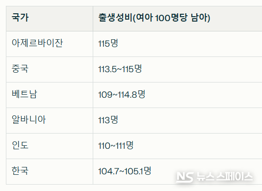 [뉴스스페이스=김혜주 기자] 한국의 남아 출생 성비가 생물학적 자연 기준인 100명당 103~107명에 거의 근접했으며, 최근 수년간 남아선호 사상이 급격히 약화된 것으로 조사됐다. 반면 아시아 일부 국가에서는 여전히 남아 출생이 현저하게 높은 나라들이 존재하는 것으로 나타났다.