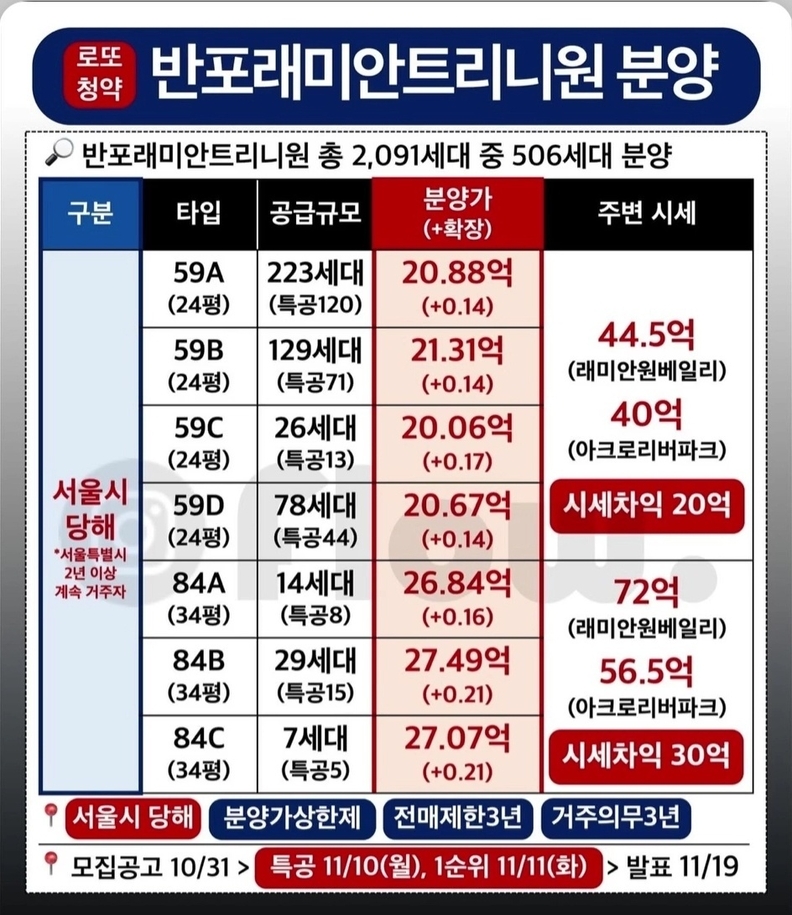 부동산 업계 관계자는 “반포 래미안 트리니원은 서울 최고 입지와 뛰어난 상품성에 합리적인 분양가라는 점에서 수많은 청약자가 몰릴 것이 분명하다. 다만 대출규제로 2억원을 제외한 나머지 금액을 10개월 이내에 마련해야 하는 점이 청약 승패의 핵심 변수”라며 “실제 청약에 나서기 전 철저한 자금 계획이 필수”라고 강조했다.