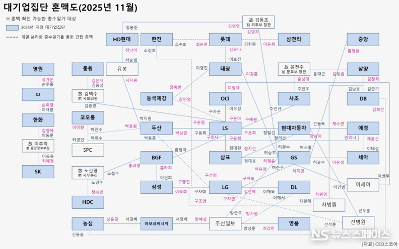 11월 12일 기업데이터연구소 CEO스코어(대표 조원만)가 2025년 지정 총수가 있는 공시대상기업집단(이하 대기업집단) 81곳의 총수일가 중 혼맥 분류가 가능한 380명을 조사한 결과, 오너 2세는 정·관계 혼맥 비중이 24.1%에 달했지만 오너 3세는 14.1%, 오너 4~5세는 6.9%로 크게 감소했다.
