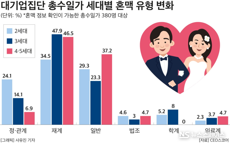 기존 오너 2세의 재계 집안 간 혼맥 비중이 34.5%에 달했지만, 오너 3세는 47.9%, 4~5세는 46.5%로 계속 늘어나는 추세다. 또한 기업총수 집안과 일반 집안과의 혼맥 비중도 오너 2세 29.3%, 3세 23.3%, 4~5세 37.2%로 꾸준히 늘고 있다.