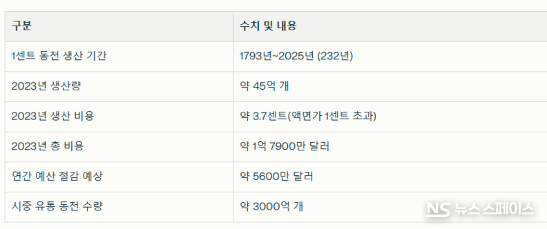 결국 232년간 이어진 미국 1센트 동전 주조가 비용 효율성 문제로 종료됐으며, 연간 5600만 달러의 재정 절감 효과가 전망된다. 트럼프 행정부와 일론 머스크의 정부효율부가 주도한 이번 결정은 인플레이션과 원가 상승으로 인한 경제 현실 반영이라는 평가다.