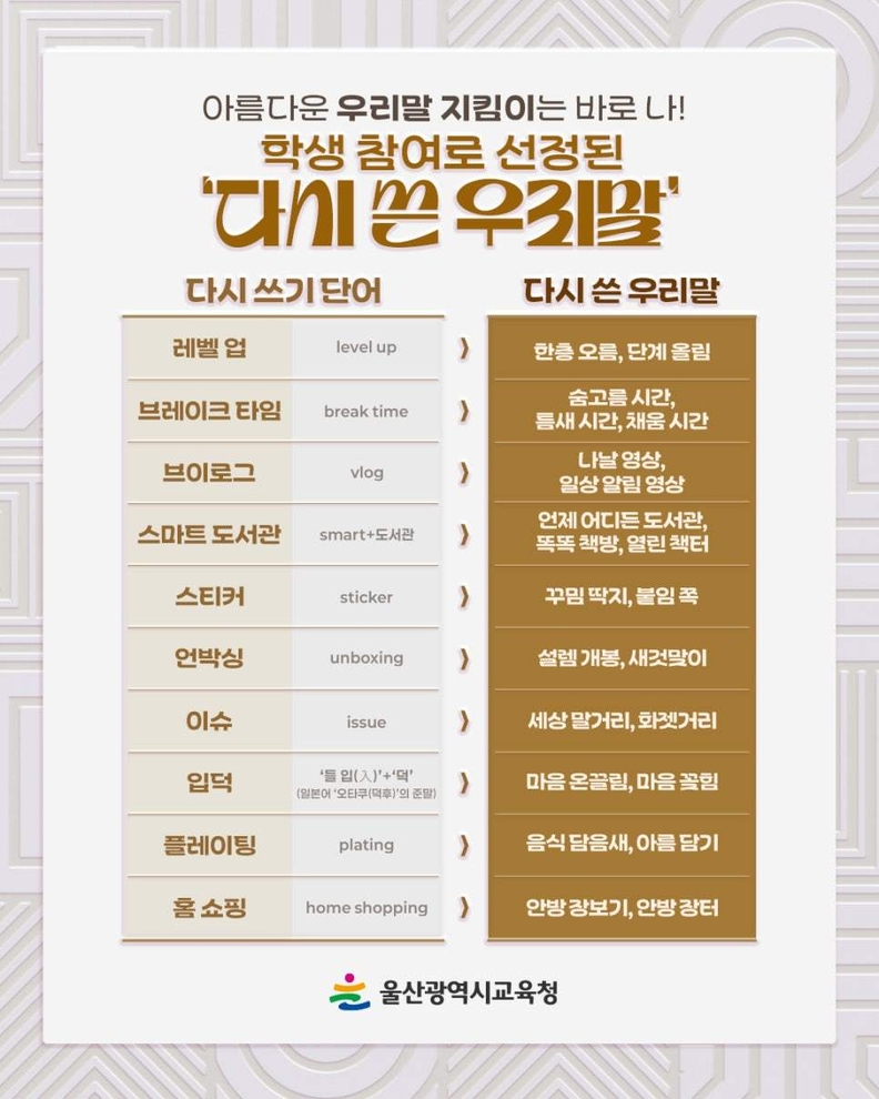 울산광역시교육청이 주관하는 '우리말 다시 쓰기' 행사가 올해도 학생들과 함께 활발히 진행되고 있다. 2025년 9월 29일부터 10월 23일까지 열린 이번 행사는 지역 중·고등학생들이 일상에서 자주 사용하는 외래어와 신조어 10개를 우리말로 순화하는 뜻깊은 참여형 교육 프로그램이다. 특히 학생들이 직접 제안한 순화어들이 화제를 모으고 있어 공교육 현장에서 우리말 사랑을 고취하는 좋은 사례로 평가받고 있다.