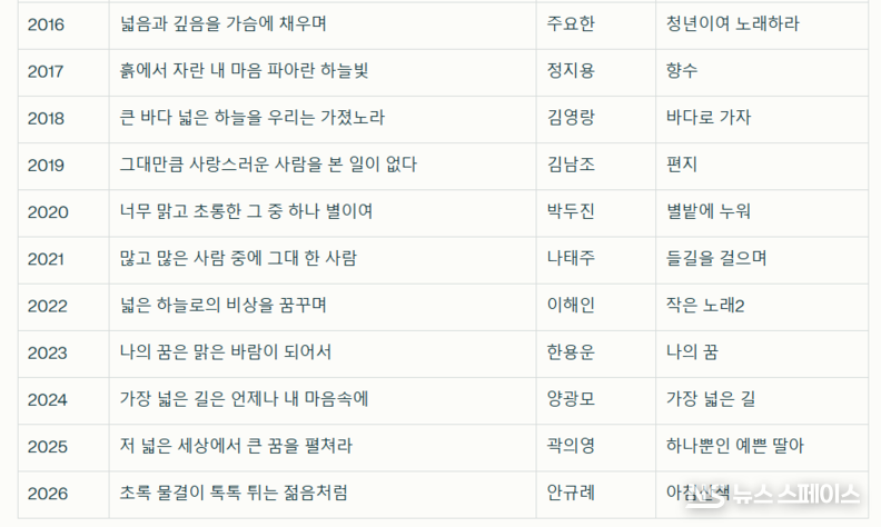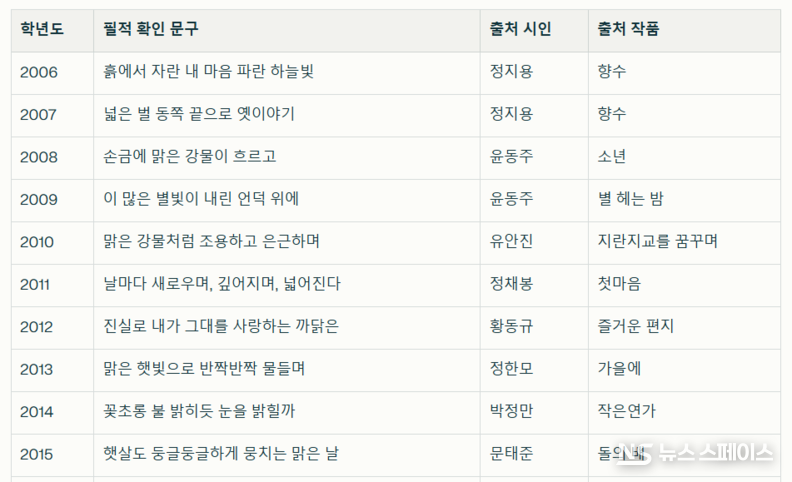 이같이 필적 확인 문구는 단순한 식별을 넘어 문학적 깊이와 정서적 지지를 담아내며, 수능 준비에 지친 수험생들에게 ‘한국 문학의 정수’를 전하고 있다. 앞으로도 수능 출제위원회의 엄격한 선정 기준과 국내 문학의 풍부한 자원을 바탕으로, 수능 필적 문구는 매년 수험생들에게 힘과 용기를 전하는 상징적인 메시지로 자리매김할 것이다.
