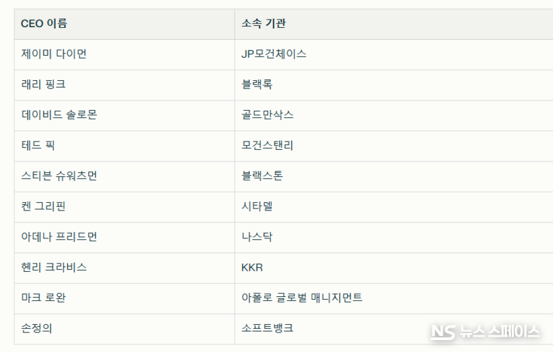 이번 만찬에는 JP모건체이스의 제이미 다이먼, 블랙록의 래리 핑크, 골드만삭스의 데이비드 솔로몬, 모건스탠리의 테드 픽, 블랙스톤의 스티븐 슈워츠먼, 시타델의 켄 그리핀 등 12명 이상의 금융계 거물들이 참석했다. 이들은 미국 경제의 핵심 인사로, 대부분 트럼프 대통령의 재정적 후원자이기도 하다.