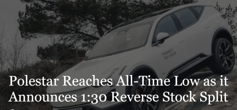 [뉴스스페이스=조일섭 기자] 스웨덴 전기차 제조업체 폴스타(Polestar)는 미국예탁주식(ADS) 30주를 1주로 통합하는 역주식 분할을 단행한다고 11월 14일(현지시간) 발표했다. 발표 직후 주가는 12.2% 급락했으며, 2022년 상장 이후 주가는 95% 이상 하락한 상태다.