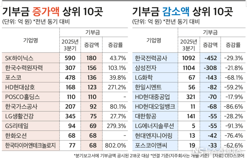 올해 기부금이 가장 크게 늘어난 기업은 SK하이닉스로, 지난해 410억원에서 올해 590억원으로 180억원 늘었다. SK하이닉스는 AI(인공지능) 메모리 반도체 시장을 주도하면서 올 3분기 영업이익이 역대 최대인 28조367억원을 기록하는 등 가파른 성장세를 기록하고 있다.