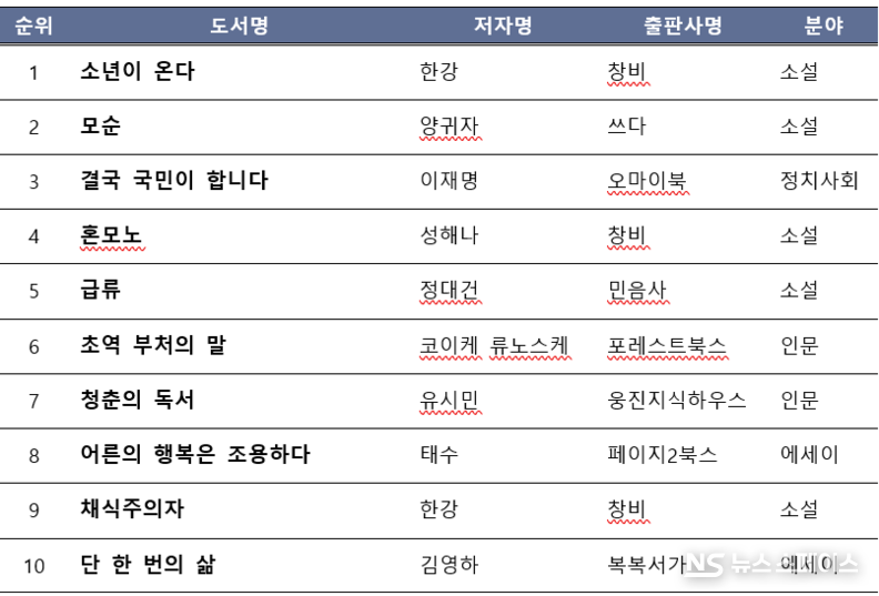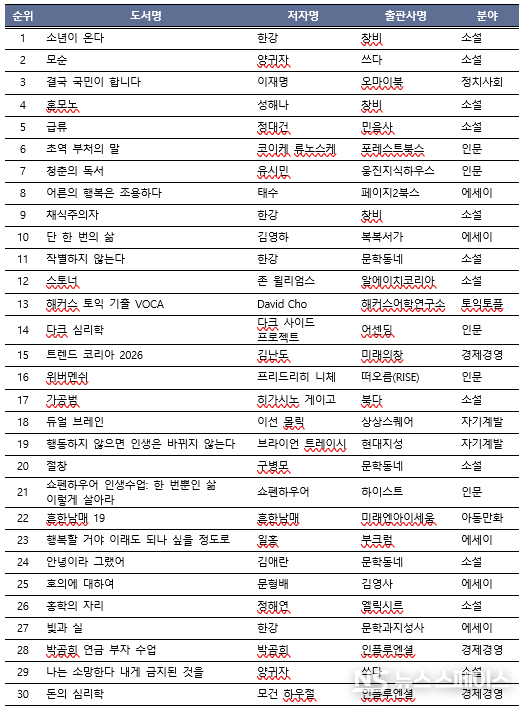 | 1. 소년이 온다(한강·창비) 2. 청춘의 독서(유시민·웅진지식하우스) 3. 혼모노(성해나·창비) 4. 결국 국민이 합니다(이재명·오마이북) 5. 어른의 행복은 조용하다(태수·페이지2북스) 6. 초역 부처의 말(코이케 류노스케 저·포레스트북스) 7. 모순(양귀자·쓰다) 8. 단 한 번의 삶(김영하·복복서가) 9. 2025 큰별쌤 최태성의 별별한국사 한국사능력검정시험 심화(1,2,3급) 상(최태성·이투스북) 10. 하루 한 장 나의 어휘력을 위한 필사 노트(유선경·위즈덤하우스) |