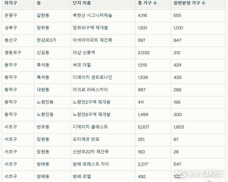 은평구 갈현1구역 재개발 단지 ‘북한산 시그니처캐슬’은 32개 동, 4116가구의 초대형 단지로, 이 가운데 555가구가 일반분양 물량이다. 성북구 장위10구역 재개발 사업은 사랑제일교회 부지 문제를 정리하고 착공을 앞두고 있으며, 총 1900여 가구 중 절반 이상이 일반분양으로 거론된다.