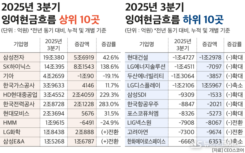 [뉴스스페이스=최동현 기자] 국내 500대 기업 중 상장사의 올 3분기 누적 잉여현금흐름(FCF)이 전년 대비 20조원 이상 증가했다. 이는 삼성전자, SK하이닉스 등 주요 기업의 잉여현금흐름이 크게 늘어난 결과다. SK하이닉스는 업황 호조에 힘입어 전년 대비 영업활동 현금흐름이 2배 가까이 급증한 것으로 나타났다.