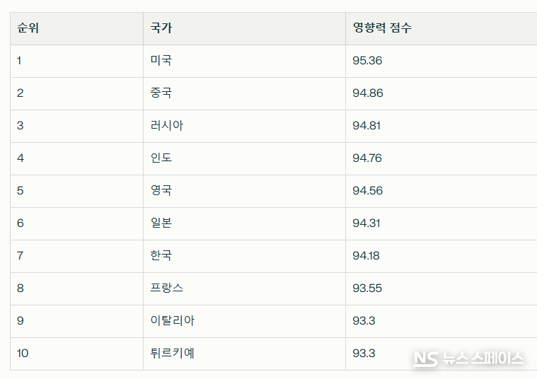 프랑스는 93.55점으로 8위, 이탈리아와 튀르키예는 각각 93.3점으로 9·10위에 올랐다. CEO 월드 매거진은 “상위권 국가들은 산업 역량, 지역 내 영향력, 동맹 네트워크를 기반으로 국제 질서에 지속적인 영향을 미치고 있다”고 평가했다.