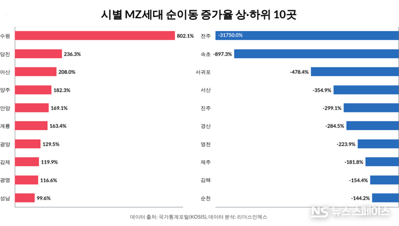 한편, 광역자치단체별 흐름을 시(市) 단위로 나눠 보면 MZ세대 이동의 극단값이 한층 분명해진다. 수원(802.1%), 당진(236.3%), 아산(208.0%), 양주(182.3%), 안양(169.1%) 등은 MZ 증가율이 높은 상위권이다. 반면 전주(-3만1750.0%)를 비롯해 속초(-897.3%), 서귀포(-478.4%), 서산(-354.9%), 진주(-299.1%) 등은 MZ세대 이탈이 확대되며 감소 흐름이 두드러졌다.