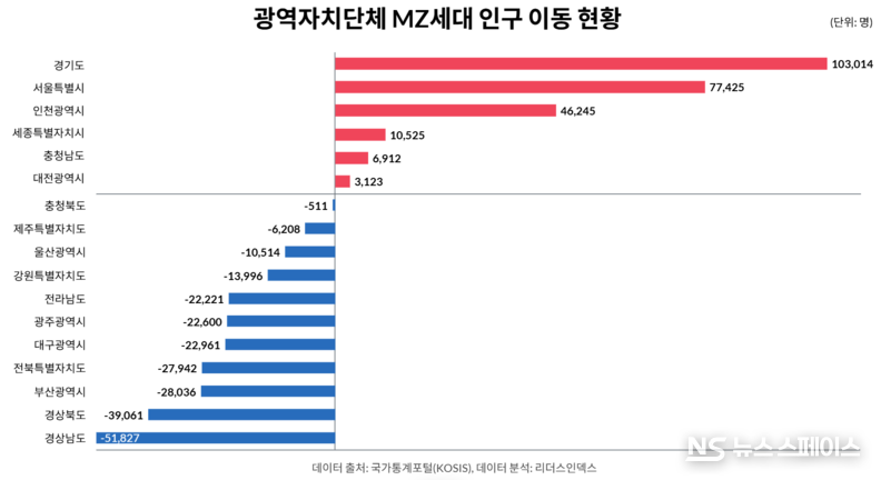 이에 비해 경남·경북·부산·대구·광주·전남·전북·울산·강원 등 다수 광역단체는 모두 팬데믹 전후 MZ세대 순유출이 지속됐다. 특히 경남은 코로나 전후 4년 모두 5만명대 순유출로 절대 규모 기준 최다 이탈 지역이였으며, 경북은 –5만명대에서 –3만9000명대로 줄었으나 여전히 전국 2위, 부산은 팬데믹 이후 2만8036명의 MZ세대가 빠져나가 3위를 기록했다.