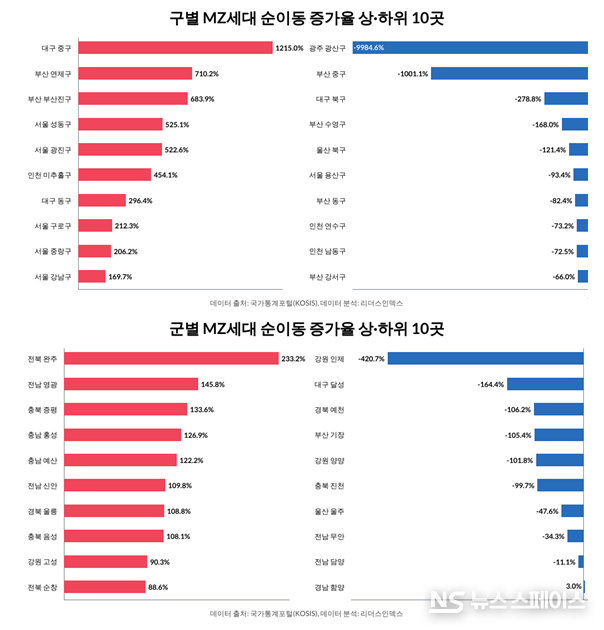 그 외 대구·부산·울산·경북·경남·전남·전북·광주·강원 등 영호남을 비롯한 비수도권 대부분 지역에서는 팬데믹 전후 모두 모두 MZ세대 순유출이 이어졌다.