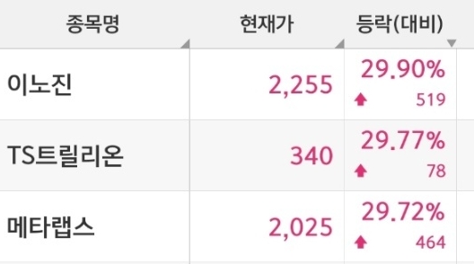 이에 반해 탈모 샴푸로 유명한 TS트릴리온(317240)은 전일 대비 29.77% 상승한 340원에 거래되며 상한가를 기록했다. 탈모관련 기업인 이노진(344860), 메타랩스(090370)도 상한가로 직행했다.