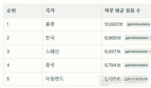 3위는 스페인 9,937보, 4위는 중국 9,794보, 5위는 아일랜드 9,735보로 조사됐다.