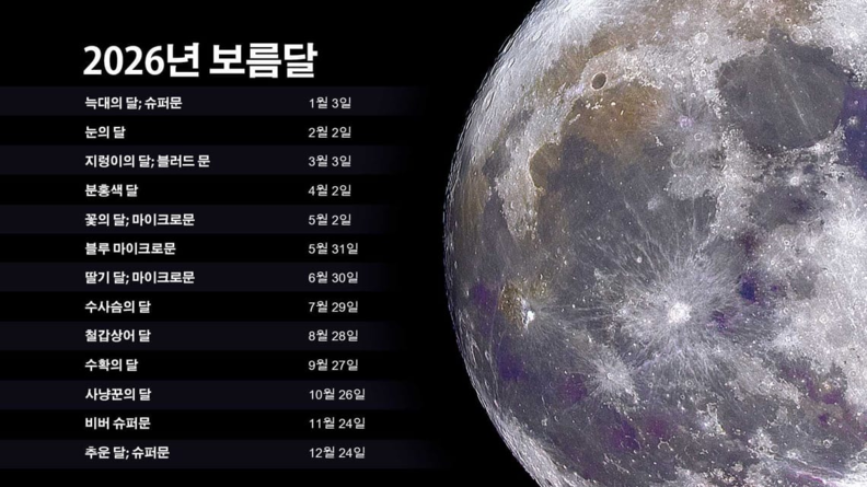 전통적인 영어권 풀문 이름을 보면 2026년 보름달은 순서대로 ‘Wolf Moon(1월 3일)·Snow Moon(2월 1일)·Worm Moon(3월 3일)·Pink Moon(4월 2일)·Flower Moon(5월 1일)·Blue Moon(5월 31일)·Strawberry Moon(6월 30일)·Buck Moon(7월 29일)·Sturgeon Moon(8월 28일)·Corn/Harvest Moon(9월 26일)·Hunter’s Moon(10월 26일)·Beaver Moon(11월 24일)·Cold Moon(12월 24일)’로 불린다.