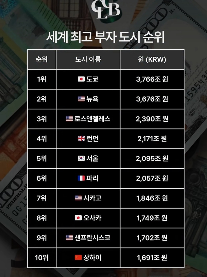 [뉴스스페이스=김혜주 기자] 세계 주요 도시의 부(富)를 한눈에 보여주는 인포그래픽 한 장이 화제를 모으고 있다. 사진 속 표에는 도쿄, 뉴욕, 로스앤젤레스, 런던, 서울 등 10개 도시가 ‘원(KRW)’ 기준 총자산 규모로 줄 세워져 있다. 사진만 보면 도쿄가 3,766조원으로 세계 1위, 서울이 2,095조원으로 5위에 오른 ‘최고 부자 도시’로 읽힌다.