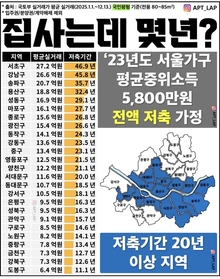 [뉴스스페이스=이은주 기자] 서울 시민이 묻는다. “집 사는 데 도대체 몇 년이 걸리나.” 서울 가구의 연간 중위소득 5800만원을 한 푼도 쓰지 않고 모은다는 비현실적인 가정 아래, 대다수 자치구에서 내 집 마련까지 최소 20년 이상이 걸린다는 분석이 나왔다.