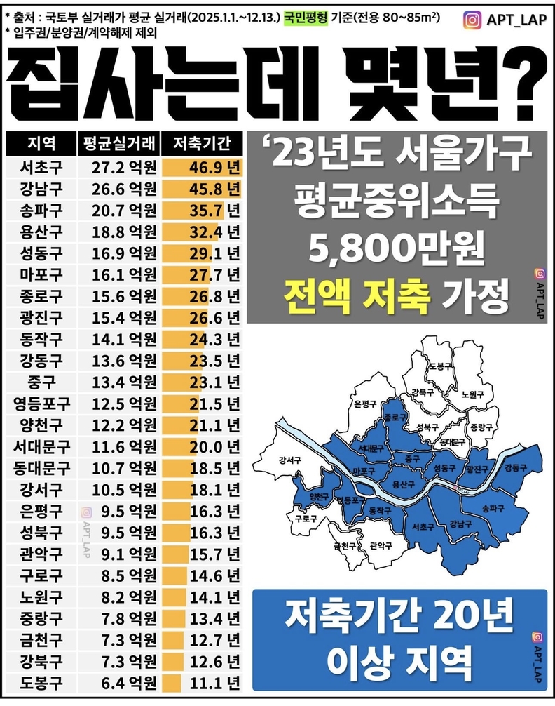 부동산 통계 계정 ‘APT_LAP’이 2025년 1월 1일부터 12월 13일까지 국토교통부 실거래가를 바탕으로 집계한 자료에 따르면, 전용 80~85㎡ 국민평형 아파트의 평균 실거래가와 서울 가구 중위소득 5800만원(2023년 기준)을 단순 비교했을 때 자치구별 ‘집값 대비 저축 기간’은 극단적인 숫자로 나타난다.