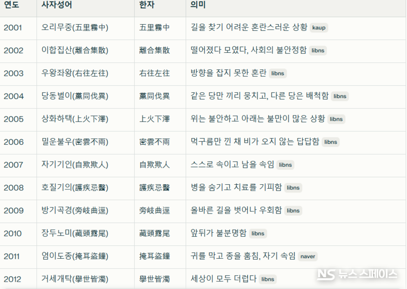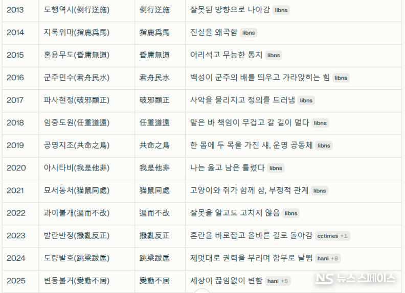 교수신문은 2001년부터 매년 올해의 사자성어를 발표하며, 그 의미와 선정 배경을 설명해왔다. 아래는 2001년부터 2025년까지 교수신문이 선정한 올해의 사자성어와 그 해 사회적 의미를 정리한 것이다.