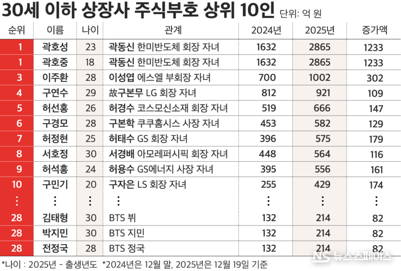 같은 기간 30세 이하 상장사 주식부호 상위 100인의 지분 가치도 8010억원(47.8%) 증가했다. 30세 이하 주식부호 상위 100명 중 지분 가치 1000억원을 넘긴 사람은 3명이다.
