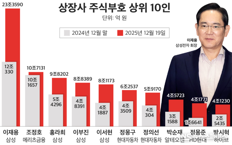 12월 24일 기업데이터연구소 CEO스코어(대표 조원만)가 지난해 12월 말과 올해 12월 19일 상장사 개별 주주별 보유주식 및 주식가치를 조사한 결과, 해당 기간 상장사 주식부호 상위 100인의 보유 지분가치는 107조6314억원에서 177조2131억원으로 69조5817억원(64.6%) 증가했다.