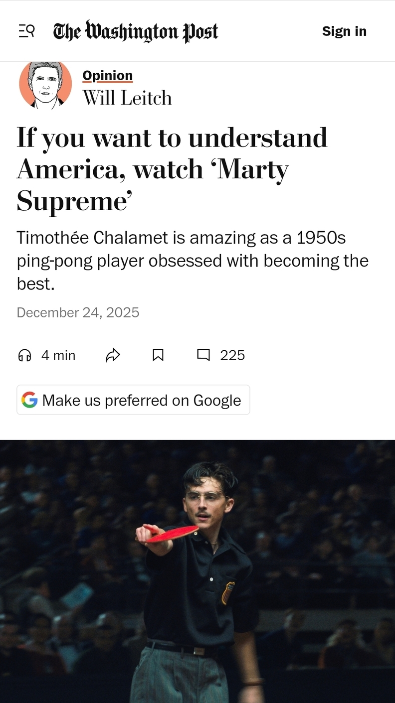 미국이라는 나라를 이해하고 싶다면, 그리고 왜 전 세계의 나머지 국가들이 미국처럼 되고 싶어 하면서도 때로는 미국을 견디지 못하는지 알고 싶다면, 새 영화 ‘마티 슈프림(Marty Supreme)’을 봐야 한다.