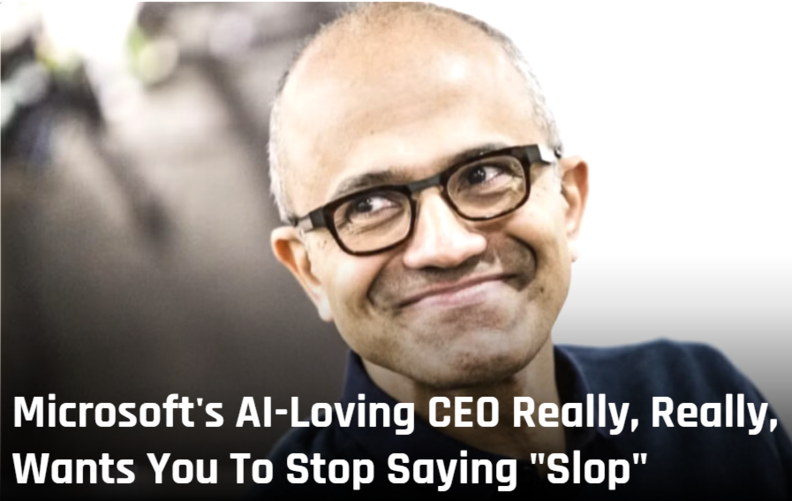 theverge, windowscentral, pcgamer, snscratchpad, the-decoder, workerscompensation, theinformation에 따르면, "슬롭(메리엄-웹스터가 선정한 2025년 올해의 단어로 저품질 AI 생성 콘텐츠를 뜻함)"을 언급한 나델라는 "새로운 '마음 이론(theory of the mind)' 균형을 개발해야 한다"고 강조했으나, 소셜 미디어에서 'Microslop'이 2026년 1월 2일 트렌딩 1위를 차지하며 조롱의 대상이 됐다.