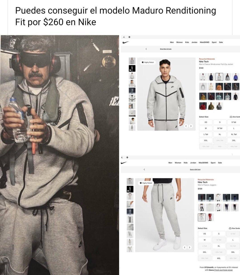 체포 당시 USS 이오지마호에서 안대와 수갑을 찬 마두로가 입은 상의(후디 재킷)와 하의(조거 팬츠)는 나이키 공식 사이트에서 S·M·L 사이즈를 비롯해 XL Extra Tall, XXL Extra Tall, 3XL 사이즈가 완전히 소진됐다.