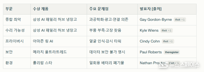 iFixit, 컨슈머 리포트(Consumer Reports), 디지털 수리권 연합(Digital Right to Repair Coalition)을 포함한 연합체가 발표한 이 연례 반대 시상식에서, "삼성의 비스포크 AI 패밀리 허브 냉장고는 음성 제어 도어 작동, 대형 터치스크린, 지속적인 인터넷 연결, 그리고 대기 시 광고 표시를 추가하여 음식을 차갑게 보관하는 것이 주요 임무여야 하는 가전제품을 문제 제품으로 만들었다"는 지적을 받았다.