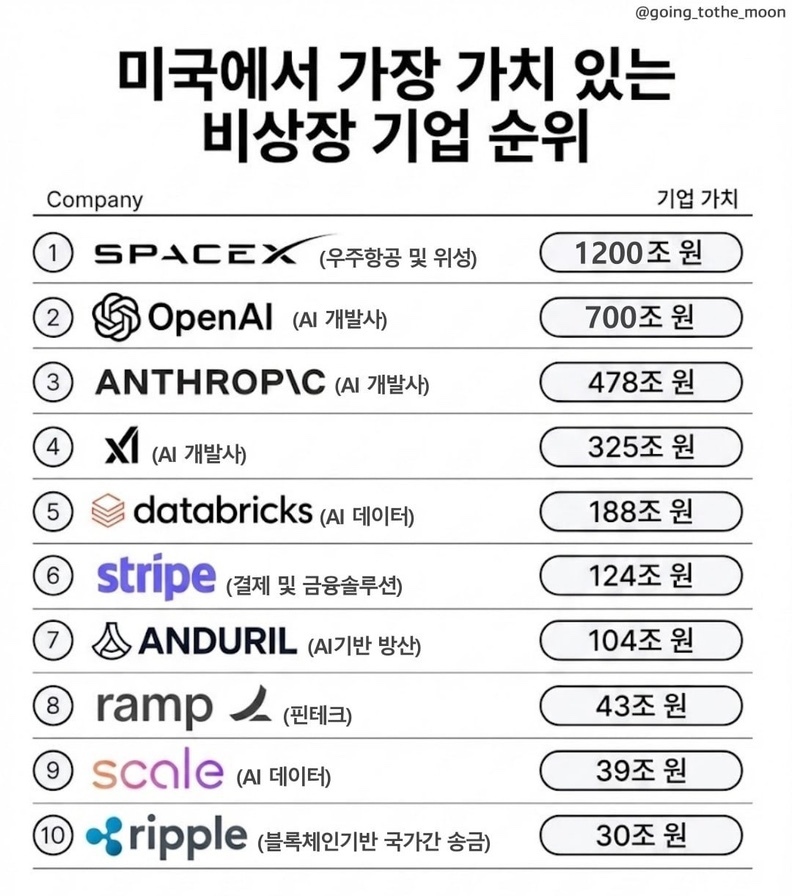 This ranking appears to reflect the recent explosive growth in AI, space, and fintech, but the actual corporate value is lower or fluctuates based on the latest funding rounds and media reports.