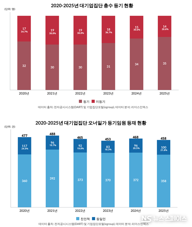 1월 13일 기업분석연구소 리더스인덱스(대표 박주근)가 자산규모 5조원 이상의 대기업집단 가운데 오너가 동일인이면서 2020년부터 2025년까지 비교 가능한 49개 그룹을 대상으로 동일인 및 친인척의 등기임원 등재 현황과 경영 참여 실태를 조사한 결과, 동일인이 맡은 등기임원직은 2020년 117개에서 2025년 100개로 14.5% 줄어든 것으로 집계됐다. 같은 기간 오너 친인척의 등기임원 등재 건수도 360건에서 358건으로 소폭 감소했다.