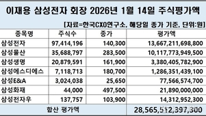 이재용 회장이 보유한 7개 주식종목 중에서는 단연 삼성전자 주식평가액 가치가 가장 컸다. 이달 14일 기준 이재용 회장은 삼성전자 주식을 9741만4196주를 보유 중인데, 같은 날 보통주 1주당 주가(종가) 14만300원으로 계산한 주식평가액은 13조6672억원 수준이었다.