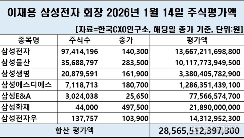 한국CXO연구소에 따르면 이재용 삼성전자 회장은 ▲삼성전자 ▲삼성물산 ▲삼성생명 ▲삼성SDS ▲삼성E&A ▲삼성화재 ▲삼성전자 우선주 이렇게 총 7개의 주식종목을 갖고 있는 것으로 조사됐다. 이들 7개 종목에 대한 이달 14일 기준 주식평가액은 처음으로 28조원대에 진입했다.