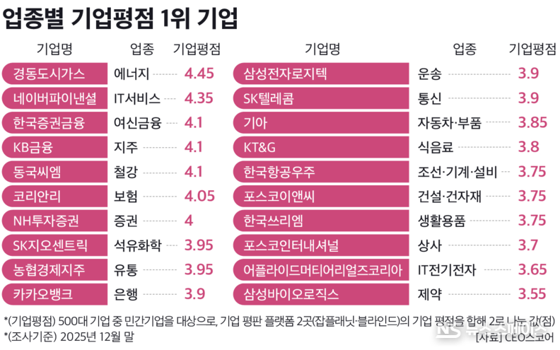그 외의 업종별로는 석유화학 업종의 SK지오센트릭(3.95), 유통 업종인 농협경제지주(3.95), 은행 업종인 카카오뱅크(3.9), 운송 업종인 삼성전자로지텍(3.9), 통신 업종인 SK텔레콤(3.9), 자동차·부품 업종인 기아(3.85), 식음료 업종인 KT&G(3.8), 조선·기계·설비 업종인 한국항공우주(3.75), 건설·건자재 업종인 포스코이앤씨(3.75), 생활용품 업종인 한국쓰리엠(3.75), 상사 업종인 포스코인터내셔널(3.7), IT전기전자 업종인 어플라이드머티어리얼즈코리아(3.65), 제약 업종인 삼성바이오로직스(3.55)가 각 업종별로 가장 높은 평점을 기록했다.