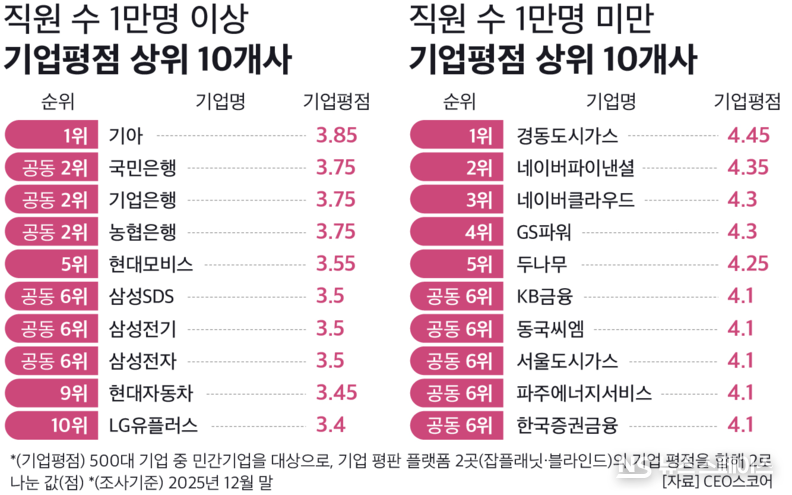 1월 28일 기업데이터연구소 CEO스코어(대표 조원만)가 매출액 기준 500대기업을 대상으로 온라인 기업 평판 플랫폼(블라인드·잡플래닛)에 공개된 2025년 12월 말 기준 조직문화 평점을 분석한 결과, 직원 수 1만명 이상 민간기업 중에서는 기아가 평균 3.85로 1위를 차지했다.