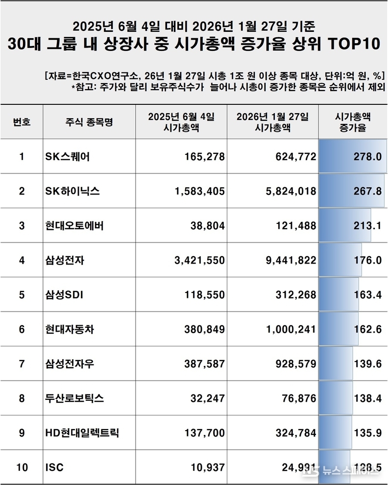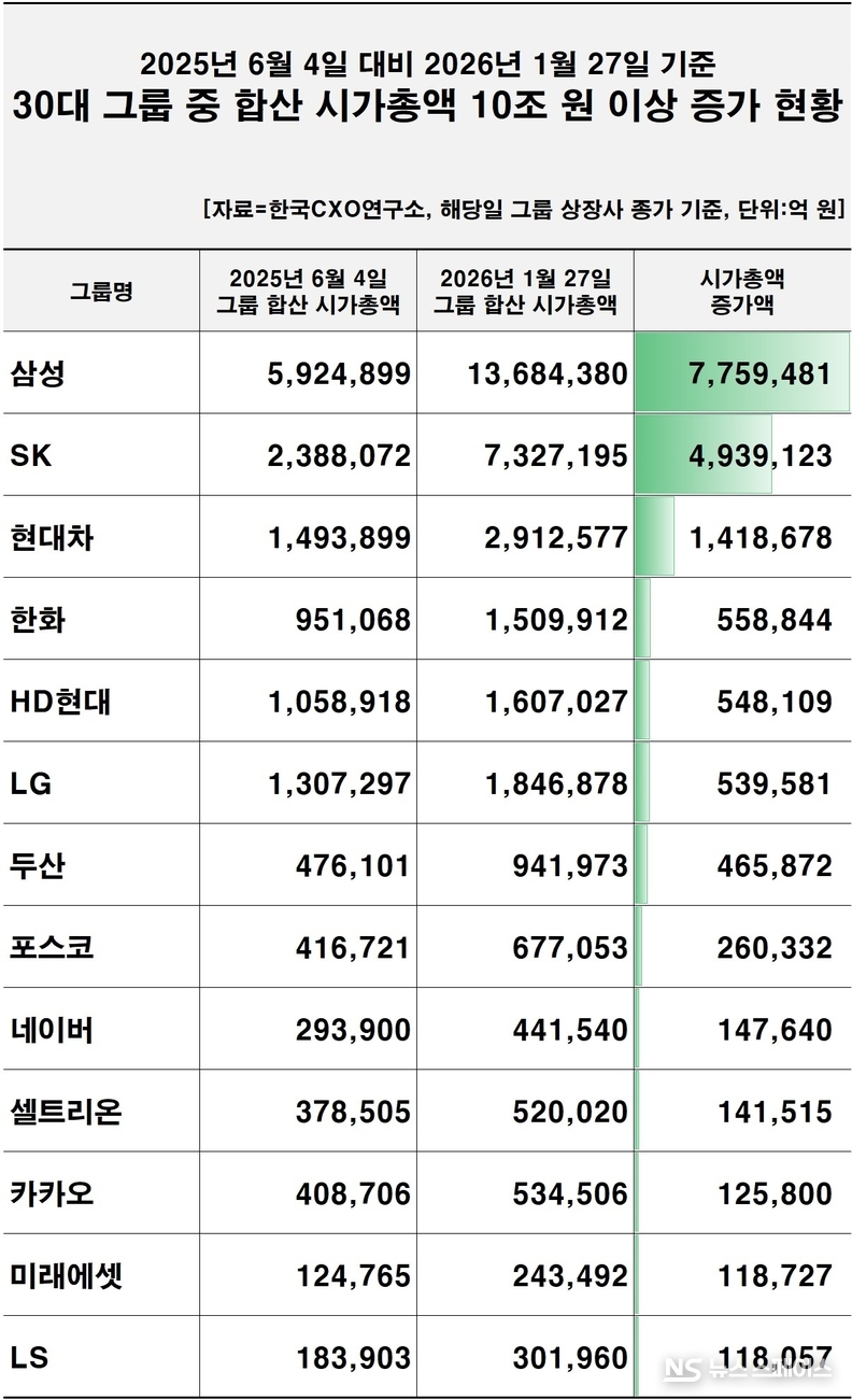 기업분석전문 한국CXO연구소가 ‘국내 30대 그룹의 2025년 6월 4일 대비 2026년 1월 27일 기준 시총 변동 분석’ 결과에서 도출된 것이라고 1월 29일 발표했다. 조사 시작일인 2025년 6월 4일은 이재명 대통령 취임일이고, 조사 마지막일인 2026년 1월 27일은 한국거래소 종가 기준 코스피 5000 첫 돌파일 시점이다.