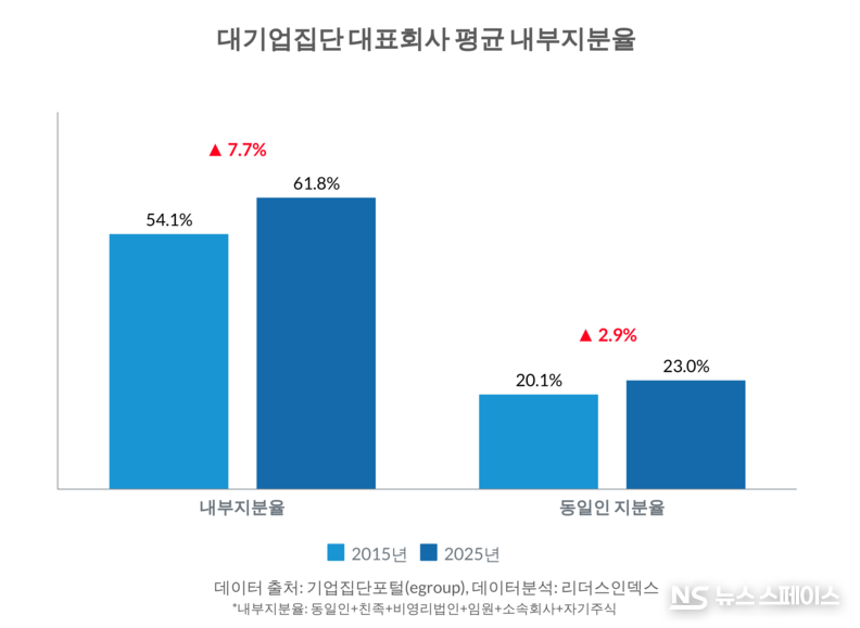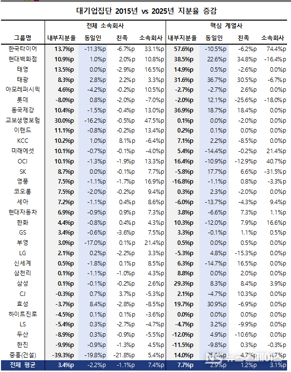 31개 그룹 핵심 계열사에 대한 동일인 지분율은 2015년 20.1%에서 2025년 23.0%로 2.9%p 상승했으며 친족과 소속회사 지분율도 각각 1.2%p, 3.1%p 늘었다. 이를 합친 핵심 계열사 내부지분율은 54.1%에서 61.8%로 7.7%p 상승하며, 지배구조 정점에 위치한 기업에 대해서만큼은 총수의 직접 장악력이 더욱 공고해졌다.