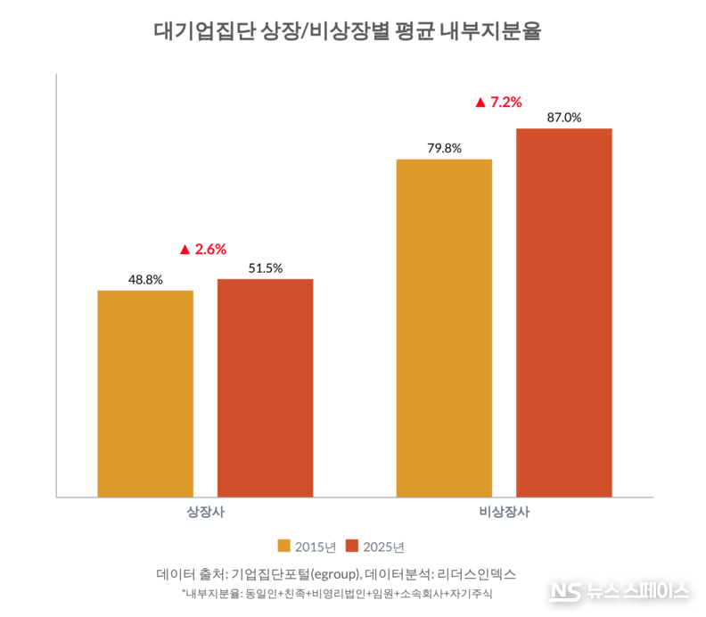 이같은 내부지분 확대 흐름은 상장사보다 외부 감시가 덜한 비상장사에서 훨씬 강조됐다. 비상장사의 내부지분율 상승폭은 7.2%p(79.8%→87.0%)로, 상장사 2.7%p(48.8%→51.5%)의 약 3배에 달했다.