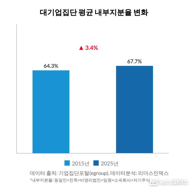 반면 소속회사(계열사) 평균 지분율은 49.4%에서 56.8%로 7.4%p 상승했다. 이에 따라 우호지분인 내부지분율(동일인·친족·비영리법인·임원·소속회사·자기주식)은 64.3%에서 67.7%로 3.4%p 높아졌다. 결과적으로 총수 개인의 직접 지분은 줄었음에도, 계열사 자본을 활용한 우호지분을 통해 그룹 전체에 대한 내부 지배력은 오히려 강화된 셈이다.
